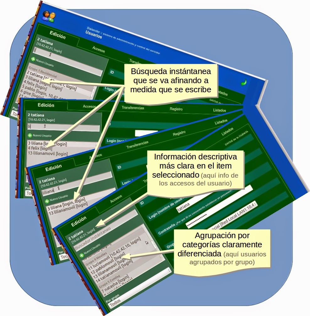 - Expansión del buscador instantaneo y selector de usuarios, grupos, redes con nuevas programaciones para facilitar la visualización, búsqueda y gestión de estas configuraciones del sistema. Gracias al avance de los navegadores y de su lenguaje de programación embebido, podemos ofrecer poderosas y rápidas funciones de búsqueda incrementales, sin necesidad de acceder las bases de datos en cada consulta. También se aprovechó para ordenar los usuarios por Grupo y mejorar la información que aparece sobre el cuadro de búsqueda.