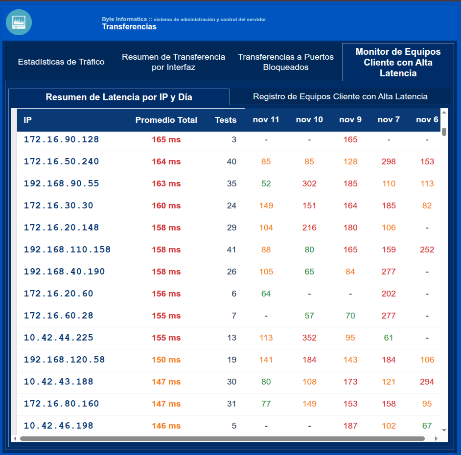 - Sislander también genera un resumen ordenado por IP de la latencia reciente promedio más alta a la más baja que puedes consultar en la página Transferencias.