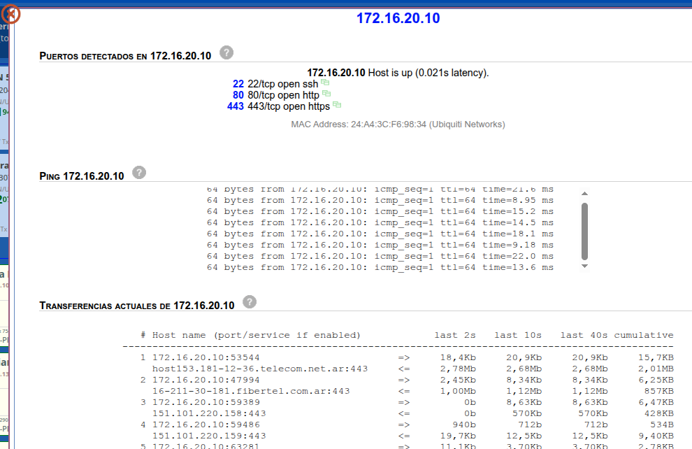 - Para evaluar un cliente en particular cuentas con el monitoreo de los dispositivos de conexión del usuario en UserTraf en el cual podrás apreciar un ping permanente al cliente y el test interno de ancho de banda que se realiza desde el cliente.